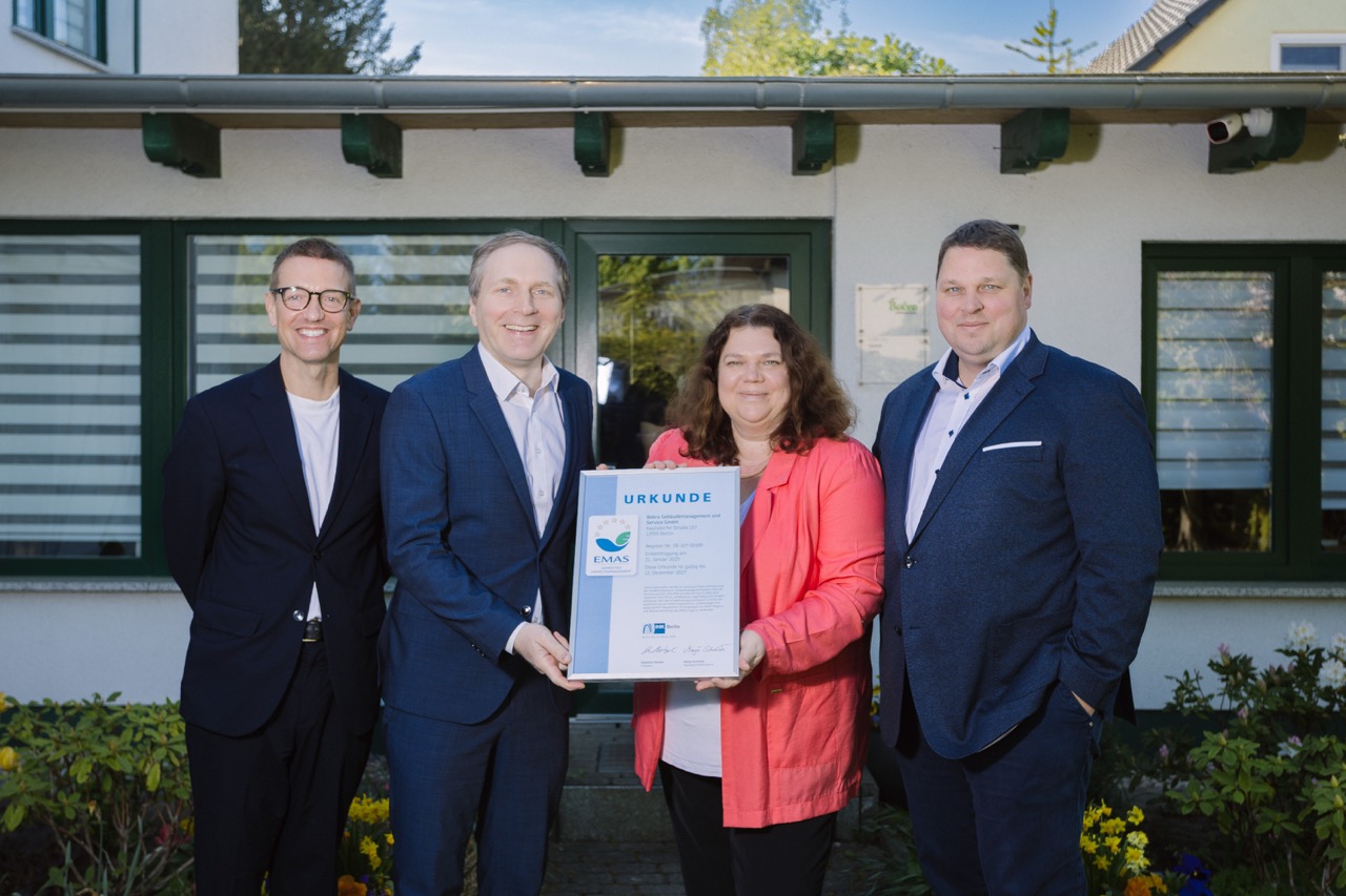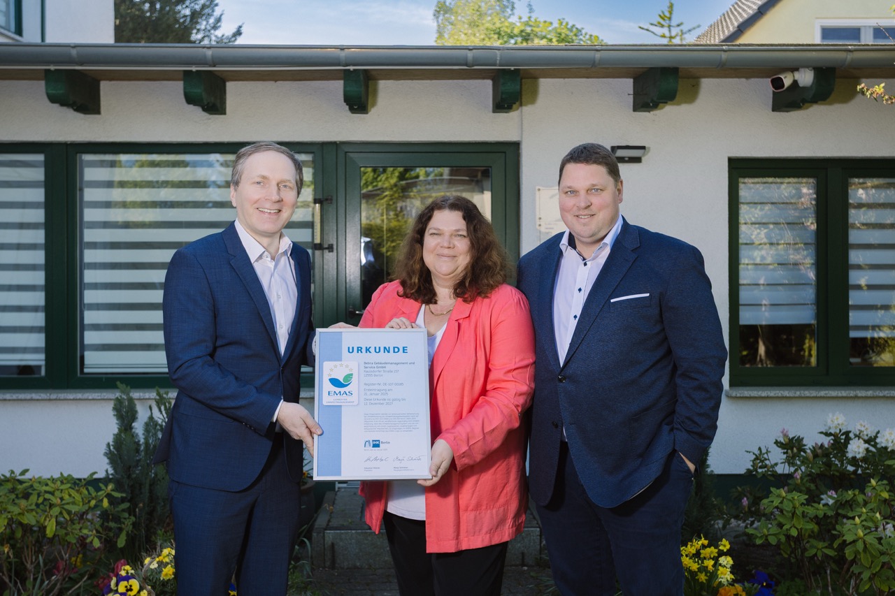 Heute hatten wir die Freude, einen besonderen Besuch von der IHK Berlin zu empfangen. Der stellvertretende Geschäftsführer Henrik Vagt überreichte uns offiziell unsere EMAS Urkunde, und wir sind überaus stolz auf diesen Meilenstein in unserem Unternehmen. Diese neue EMAS-Zertifizierung reiht sich perfekt ein neben unsere bestehenden ISO-Zertifikate für Umweltmanagement (ISO 14001), Qualitätsmanagement (ISO 9001) und Arbeitsschutzmanagement (ISO 45001).